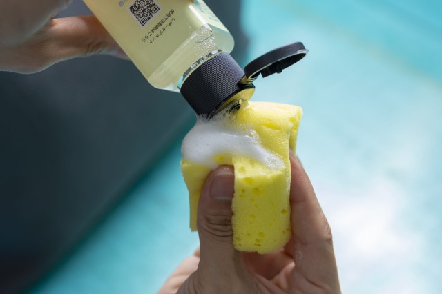 雨ジミや日常の頑固な汚れを取り除くには、革専用のクリーナーが有効。クリーナーを手のひらサイズの柔らかいスポンジ(メラミンスポンジは不可)に染み込ませ、泡が十分に出るまでスポンジをよくもむ。