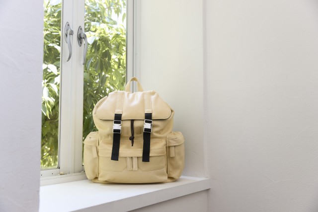 兵庫県姫路市の老舗タンナー、山陽が得意とする防水革を使用したフラップリュック。牛革を丸4日間かけてゆっくりとほぐすことで、しっとりとした柔らかさと自然な風合いを引き出した。デザインの着想源は、姫路城の天守閣。内部には大天守を支える柱をヌメ革で表現するなど、見えない部分にまでレザーへの深い敬意と職人の美意識が息づく。制作はすべて国内の熟練職人による手仕事。