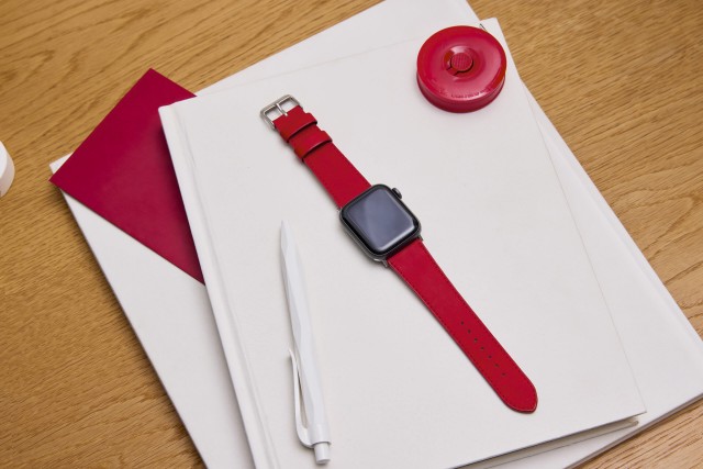 印象に残る、鮮やかなレッドの宮崎県産和牛革を用いたApple Watch用バンド。しなやかな質感で手首に心地よくフィットし、本革ならではの耐久性も兼ね備える。ミニマルなデザインが色彩を引き立て、ジェンダーを超えた装いに映える。使い込むほどにツヤを増し自分だけの風合いへと育っていくのも魅力。