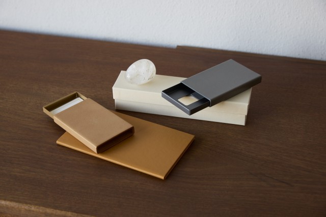 レザーのスリーブからアルミ製ケースを引き出すカードケース。レザーブランド「ke shi ki」と、デザインオフィス「イド」のコラボレーションによって生まれた。内側に施された精巧な仕組みにより、アルミ製ケースが心地よくスライドし、手に取るたびにつくりの良さを実感。異素材であるレザーとアルミが、洗練されたカラーリングで絶妙に調和する。