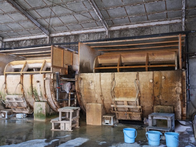 “パドル”と呼ばれる巨大な木製の半円筒型槽が並ぶ光景に、思わず伊藤さんが声を上げた。この中で行われているのは、“水戻し”と呼ばれる最初の工程。塩漬けされた馬の原皮をまる一日かけてもとの状態に戻していく作業だ。