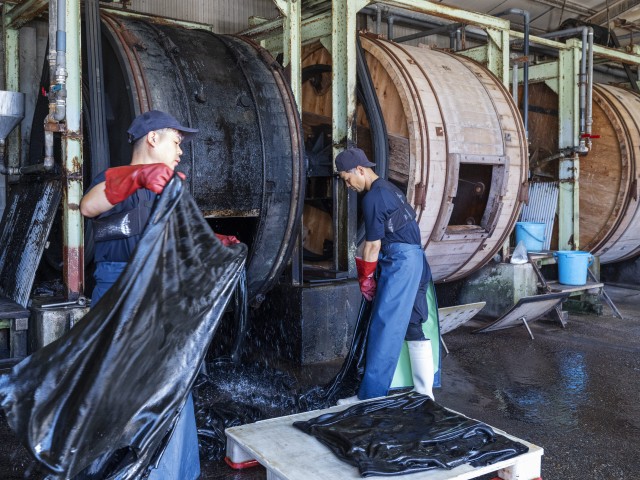 「塩でギュッとしまっている皮を、まず生皮の状態に戻す作業です。これは革の質を決める、大事な作業なんです。何事も第一歩がいちばん肝心ってことですね」と話すのは、カドヤ商店の角谷領一さん。父で2代目の角谷美彰さん、そして3代目となる兄の角谷賢作さんとともに、馬革に特化した製革業を営んでいる。