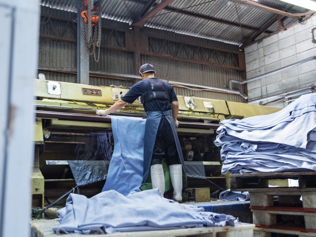 染色の作業。濡れた革は非常に重く、すべて手作業で行うため重労働だ。